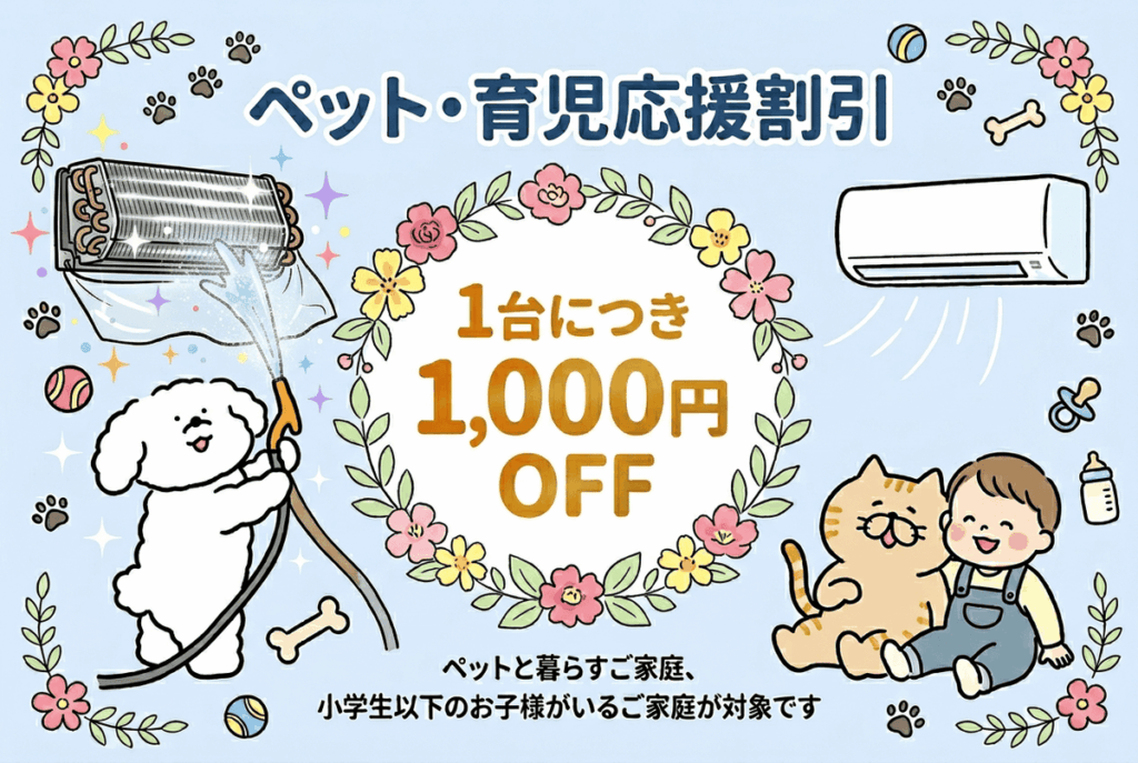 ペットと暮らすご家庭、または小学生以下のお子様がいらっしゃるご家庭は、応援価格として基本料金より1台につき1,000円割引いたします。
